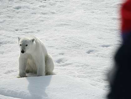 Upon leaving the ice cap we encountered a young polar bear in the sea ice. This bear allowed a prolonged and close encounter that will prove to be one of the highlights of the season. It was initially observed scavenging on a kill with attendant glaucous and ivory gulls. After awhile it became curious towards the ship and made a close approach, settling down near the vessel to clean after feeding.