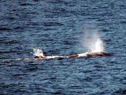 Sperm whales are the largest of the toothed whales and this one appeared to be a large male, about 50-55 feet in length. When sperm whales rest at the surface to replenish their oxygen supply, the behavior is called “logging” because at a distance they look like a log floating on the water. Sperm whales have a single blowhole like all the toothed whales, but in their case it is located at the front of their huge head and on the port side, so that their blow is at an angle of about 45 degrees forward and to port. As they are the only whale which blows this way, once we spot the signature blow the identification is positive. As we approached the animal it continued to log, taking several breaths. Unlike humans, who replace only about 15% of our air supply with each resting breath, sperm whales can exchange perhaps 85-90% of theirs, which makes their breathing much more efficient. They then store the oxygen in the myoglobin in their muscles rather than carrying it in their lungs as they dive. After logging at the surface for several minutes, this whale fluked out and dove, probably for a deep feeding dive which might take it several thousand feet down in search of giant squid, the sperm whales’ favorite prey. So we said goodbye to this magnificent marine mammal and came back to our course for the Cape Verde Islands. All in all, this was a wonderful day at sea, both relaxing and exciting, as well as intellectually stimulating and thoroughly enjoyable.