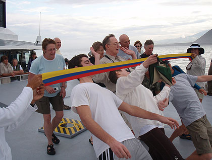 Rainy season! Well, for sure until yesterday. Today, however, during our navigation along the northern shore of Isabela Island, we noticed that something was different. There were lots of disruptions at the surface of the ocean caused by the emergence of cold deep water, the upwelling. On these, lots of birds and sea lions were gathering; a real frenzy displayed in front of our eyes. Also, we experienced a cold breeze, but coming from the northwest, while the swell was coming from the northeast. At the distance due west, we all saw how heavy clouds were being formed while, very close to the ship, it was possible to see the evaporation of the surface water in the form of this light mist. While all these things were happening, we were once again able to cross successfully the equatorial line. And it was a rush!