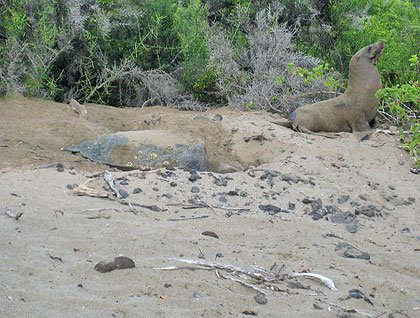 After a delicious Ecuadorian buffet-style lunch, we arrive to Santiago Island for our afternoon walk to the grottos of Puerto Egas to see the Galápagos fur seals. On the way to the grottos we had a fantastic walk along the shore. We were able to see a couple of American oystercatchers taking care of their young, baby sea lions playing in the natural water pools, hundreds of marine iguanas, a great blue heron, pelicans, sanderlings and of course the highlight of the afternoon, the fur seals.