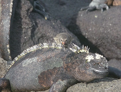 The tide was very low today and we landed on the black rocks. We saw green algae on the rocks and immediately we thought life here was easier today, for the marine iguanas had food served on the rocks and did not need to dive for eating. Walking through the rocks, we had our attention called to something special: a small Darwin finch was cleaning an iguana, eating the molted skin from the tail up to the head. It was noticeable how the face of the iguana demonstrated it liked the cleaning.