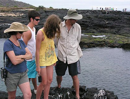 Later in the morning we went around Champion Islet by Zodiacs. It was a nice cool morning highlighted by lots of marine birds like Nazca boobies, Swallow tailed gulls, Frigate birds, Brown noddies, Blue footed boobies and many other creatures like playful Galápagos sea lions and colorful Sally Lightfoot crabs. After the rides, many of us got ready to explore the islet in a different way. We went snorkeling and found lots tropical fish, including sharks, and sea lions.