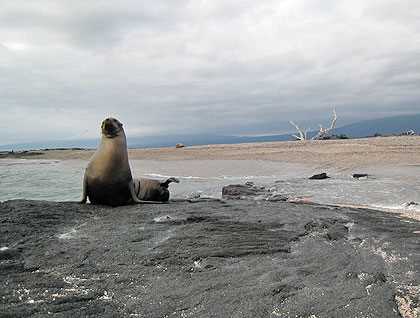 The afternoon walk at Punta Espinoza was wonderful. The huge shield volcano serves as a backdrop for the trail that leads out to a rocky point. We enjoyed watching playful sea lions, and cormorants and some of us found some hard-to-find species: two Galápagos snakes and an endemic rice rat. There were literally piles of huge marine iguanas, bright red Sally light foot crabs and dark lava lizards that darted around our feet after flies.