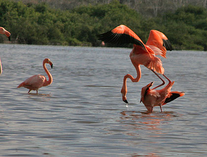 We had lunch while the ship navigated to Punta Cormorant, the northernmost point on Floreana. In the afternoon some of our guests went kayaking, while others went to the beach and some enjoyed a siesta; at four o’clock we all went ashore to visit Punta Cormorant. Here we saw flamingos mating and displaying a very nice courtship. We also saw white checked pintail ducks, the olivine sand formation, a lovely fine white sand beach which is a major sea turtle nesting area, and sting rays in the shallows.