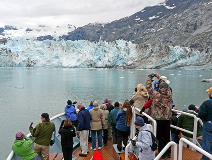 In Johns Hopkins Inlet, we rounded Jaw Point to behold Johns Hopkins Glacier and the surrounding scene. A clear path led us to a safe distance from the face of this tremendous glacier, one of just a few in Alaska that is advancing. A large calving event drew our attention to the right side of the glacier (from our perspective), where we noticed hundreds of harbor seals resting on icebergs. On the way out of the inlet we stopped by the lovely blue Lamplugh Glacier, where we marveled at water gushing through a tunnel in the ice face.