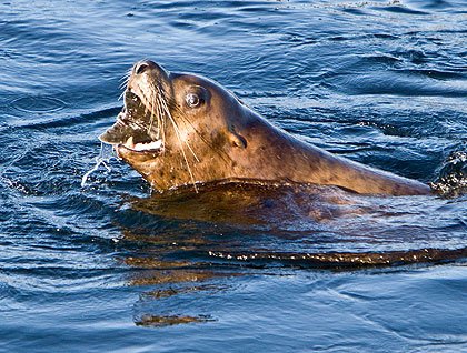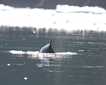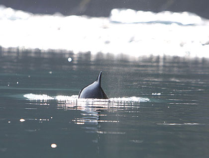 A single killer whale followed a current line, surfacing every few minutes on a slow swim. The distinct dorsal fin approximately five feet in height and slightly curved to the right are field signs of an adult male. Our Captain positioned the ship for viewing in the perfect light. Tall misty blows of a humpback whale interrupted the watery edge in the shadows where the shoreline meets the sea.