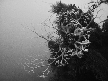 Just a few kicks away, another prize was found. Related to snails and slugs, a nudibranch of the genus Dendronotus was cruising the red algae and rocks for its next meal. Light pink with white-tipped, tree-like protrusions along its back, this type of sea slug often feeds voraciously on anemones, sometimes taking just one tentacle at a time. Once again, David squared up and began shooting, but by this time the cold was really setting in and it was time to start thinking about surfacing.