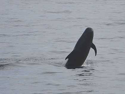 Our first full day of exploring the Gulf of California was a good reminder of the reason why we love this place. We cruised through the early morning in the proximity of Isla del Carmen. Several groups of bottlenose dolphins joined us to play with the ship's bow and wake. Shortly after breakfast, a group of about 25 pilot whales was seen in the distance. As we approached we realized that most of the individuals of the group were females and young, mature males being absent. The whales approached the ship and we had amazing looks at these unusual looking cetaceans. We deployed our hydrophone to see if we could detect any of their submarine communication sound waves. Most times, pilot whales prove to be quite silent, but today innumerable screeches and high pitched whistles could be heard.