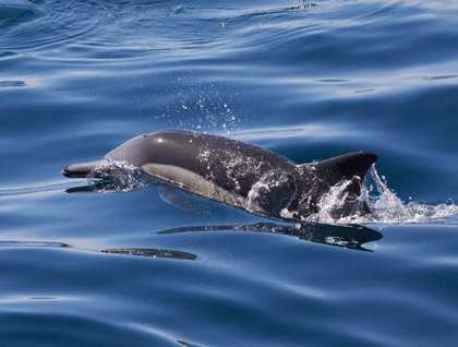 After breakfast and throughout the day, in incredibly fine weather, the encounters with spectacular wildlife were unending. First came a group of over 1000 common dolphins. As we made our way back and forth among them for about an hour, they rode the bow of the ship or the stern wake or leapt high in the air or just swam around us, surfacing in the clear mirror surface of the water. It was so beautiful and peaceful that we had to remind each other to remember to breathe!