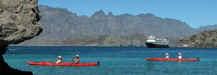 We landed on Isla Danzante, a small, rocky island within Loreto Bay National Park. Kayakers paddled along the deeply indented shore, where waves had eroded and undercut the volcanic rocks just above the tideline. Snorkelers discovered a variety of invertebrates including flower urchins and sun stars. Although the island is relatively tiny, there are trails that wind up to spectacular viewpoints overlooking the ship, embraced by intricate contours of the islands and adjacent peninsula. Many hikers spotted a school of king angelfish that circled far below in the teal-blue water.