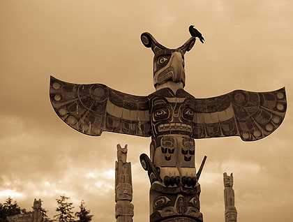 Sloshing ashore to a shingle beach, you notice the sweet aroma of cedar smoke infusing the damp, salty air. As the familiar calls of ravens echo from the forest, you begin to see totem poles rising through the mist. Then you hear the sound of distant drums.
