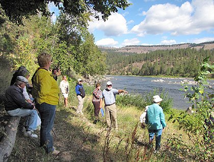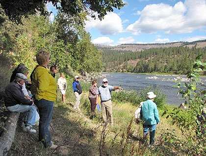 On the trip through Clearwater Country, our guides were local historians Lin Laughy and Miguel Inzunza, who read from the journals of Lewis and Clark and explained the interactions between the Corps of Discovery and the Nez Perce. We gained a deeper appreciation of the warm relations between these two groups when we stood on the exact spots where they interacted in a rich cultural exchange. We stopped at Saddle Cache Camp, where Lewis and Clark stored their saddles while going to and from the coast; at a spot on the bank of the river across from the Expedition’s Long Camp; at Treaty Council Camp; at Chief Broken Arm’s lodge on Lawyer Creek; in Kamiah for a delightful café lunch; at the Heart of the Monster, the legendary site of the origin of the Nez Perce, where Lee Hamilton taught us to make rope and start a fire; and at Canoe Camp, where the Corps made dugouts from ponderosa pines.