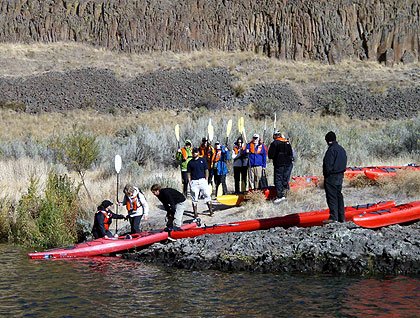 By lunchtime we started to pull into the mouth of the Palouse River, and by two o'clock everything was in place and we were raring to go. Off to Palouse Falls to see the impressive canyon lands carved by the ice age floods, and up the Palouse River by Zodiac and kayak to crane necks high and higher to gaze at the basalt lava layers. Golden eagles and mule deer were the mega fauna seen, though evidence of beavers in the area was obvious – a lodge has been in the process of construction for the last few weeks. Buffleheads and coots were the predominant waterfowl, and in the weeks to come more and more species will start to show up as the fall migration picks up momentum.