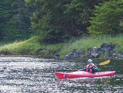 Conditions for our afternoon of exploration were no different – perfect. Hanus Bay has a lake-fed stream just waiting for the life giving salmon that are starting to arrive: we witnessed them swimming by just inches below the water’s surface. The incoming tide allowed us to explore upstream by kayak and Zodiac. Those hiking also reached the tumbling cascades and the old-growth spruce upstream near Lake Eva.