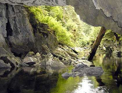 Some of the bedrock in this area is limestone, and in the temperate rainforest of Southeast Alaska, where plant tannins and abundant rain provide the perfect conditions for sculpting this rock, limestone can create some remarkable features. Our water explorations took us in small groups into a grotto, a high-ceilinged cave with one end open to the sea and the other being carved out as we watched (OK, slowly) by a fast-flowing stream. The echoing stillness of the grotto and the layered smooth curves and angles of the water-carved rock were captivating. Kayakers and zodiac cruisers alike delighted in the feel of the stream’s current gently taking our boat as light and shadow played over the faces around us.