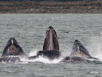 Cooperative bubblenet feeding! This is the most spectacular of humpback whale behaviors. We gasped and whooped while camera shutters clicked. Soon we got the rhythm of this wildlife event. The whales would breathe a few times, milling around each other, then show their flukes as they made deeper dives.