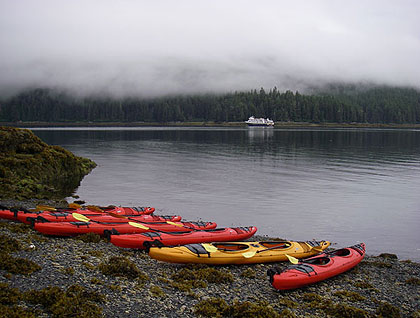 Sea kayaking is one of the best ways to explore the natural wonders of Southeast Alaska. So it was no surprise when twenty guests jumped at the chance to start their day by kayaking the south arm of Kelp Bay on the northeast corner of Baranof Island. We were dropped off at the mouth of the arm and spent several hours paddling to the beach at the head of the bay where others from the boat were enjoying the low tide on foot.