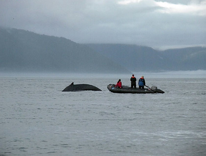 In the afternoon, we loaded into Zodiacs and cruised through the Inian Islands. Stellar sea lions were in abundance and we enjoyed their gregarious companionship. It was a bit surprising that they were so friendly, because nearly all of them were rejected suitors on the mating grounds. They approached our Zodiac and playfully dove under like a well choreographed ballet at sea… flipping and turning and leaping out of the water! It was truly an amazing site! Also sighted were bashful sea otters hiding in their bed of kelp and our first glimpse of a tufted puffin!