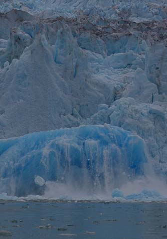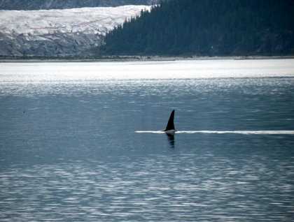 The show began at 6AM for those who heeded the soft PA message from Expedition Leader Tom O’Brian that Orcas had been sighted near Thomas Bay. For more than an hour and a half we discretely followed a male and female as they periodically surfaced with a slow majestic rise of their towering dorsal fins. Many photos were snapped, especially when they were travelling across the front of the Baird Glacier.