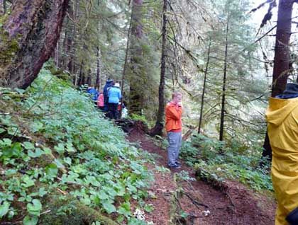 Cascade means falling water and that is certainly what was happening along Cascade Creek during our morning walk/hike. Fed by the almost continuous rain that had fallen during the past two days, the creek was a white water torrent. Near the large waterfall, spray blew across the trail like a hurricane coming onshore. Further upstream, the creek bed was filled nearly to the brim. The long hikers learned that a couple of miles on a genuine Alaskan fisherman’s trail can feel like twice as much after all of the roots, rocks and other impediments are negotiated. This was a strenuous hike but the ambiance of the primeval forest made the effort well worthwhile. While we were on the beach an added bonus for the morning hikers was a distant view of the tall dorsal fin of a male Orca plying the waters of Thomas Bay.