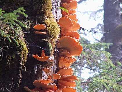 Dark shapes of rocky intertidal coastline and outlines of tall conifer trees slowly materialized from the fog bank that shrouded Mitkof Island this morning. The mist cloaking the shore provided a dramatic background for our adventures into the mystery and drama of a healthy old growth-temperate rainforest. Huge Sitka spruce and western hemlock trees draped with lichens and mosses dominated the scene while newly sprouted fall mushrooms and red dots of bunchberry decorated the forest floor and many of the decaying trees.