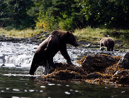 Mid-afternoon: Kayaking and zodiac cruising while watching SIX bears feeding on salmon. This included three large adult coastal brown bears and one female with two-and-a-half year-old cubs. We could watch the bears go about their natural behaviors without any human disturbances – BRILLIANT!
