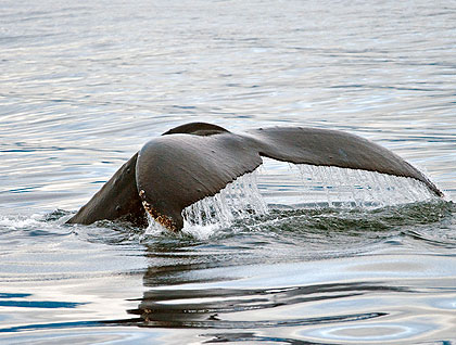This was a Monday morning never to be forgotten! Humpback whales were all around the boat before breakfast, the sharp yet soft sounds of their exhalations punctuating the stillness with the magic of being so close to these glorious animals in their Southeast Alaska wilderness home. Plumes of vaporized whale breath hung in the quiet air and hovered over the dark calm water. What a thrill to see four huge whales moving together so near the shore!
