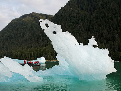 Back to “Plan A.” Yesterday’s weather was left behind as we awoke on course for LeConte Bay and a morning of Zodiac cruises among the icebergs. A swift tide flowed down from the glacier, and bergy bits, growlers and smaller icebergs moved rapidly between the larger beached icebergs.