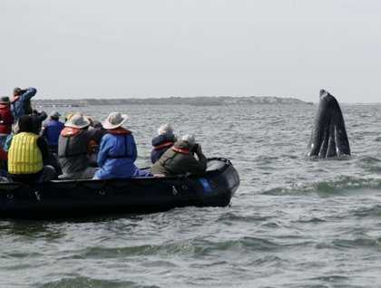 The star talk scheduled by our Expedition Leader for 4:30am today drew less than a stellar crowd. Even the leader was a no-show. It is obviously difficult to catch an April Fool on the National Geographic Sea Lion. But we had takers of another kind. Shortly after a cloud-filtered sunrise, a mother gray whale led her robust calf very close to our anchored ship and then continued south in the quiet waters of the canal. Wide eyes and rapid-fire cameras recorded this short parade. Soon after, they or another mother/calf pair drifted past us, this time heading north in a similar leisurely fashion. This was our invitation to hop into soft-sided Zodiacs to get close to these magnificent creatures as they explored their nursery habitat. These whales seem entirely receptive to small boats that hold strange, gangly creatures, even after humans twice drove them almost to extinction. We followed quietly behind them, puzzling over their every move. What was going on under the surface? There could be no doubt that tactile contact between mother and calf, and nursing, were important. The baby must gain hundreds of pounds per week, both muscle and insulating blubber, in order to survive a long and challenging swim north to cold Arctic waters. Before noon, the unimaginable curiosity that this species has shown in the past few decades began. They bumped and played with our boats, even allowing anxious hands to reach down to touch them.