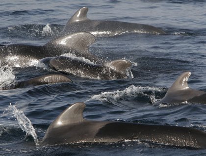 Distant dorsal fins rose and submerged again; large, rounded dorsal fins. Pilot whales! We moved slowly to position them on our starboard side. Low sunlight gleamed off their charcoal bodies. Sexual dimorphism is a key feature of pilot whales. The older males sport a huge, rounded dorsal fin, while those on the females and young are smaller and less bizarre. Among this pod were a few acrobatic bottlenose dolphins, leaping occasionally, but generally keeping pace with their larger, toothed cousins. Both are members of the dolphin family.