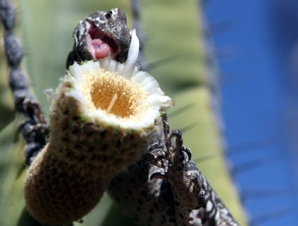 After breakfast we took walks through the arroyos to experience the essence of the island. Its majestic cardones lined the horizon, and among them we enjoyed the always exciting search for the elusive pinto chuckwallas and spiny tail iguanas. We were very lucky to find a young spiny tail lizard that climbed to a cardón cactus to feed on the petals of a flower. This way the iguanas can get sugars and moisture that are otherwise hard to find during the rest of the year.
