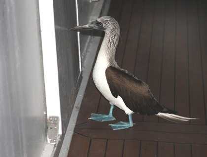 During the night the National Geographic Sea Lion reached its anchorage beside a remote island that attracts tens of thousands of nesting birds each year. Occasionally a seabird will land on a ship in the darkness. Perhaps it seems like a convenient perch, or possibly the bird becomes confused by the lights. Once on deck, it is nearly impossible for many of these creatures to take off. They are accustomed to flapping across the water for take-off or to launching off a cliff where they can gain air speed before flying away. The blue-footed booby in the photo knocked on the doors of a couple of guest rooms as it walked pigeon-toed past the 200-level cabins. One guest heard the knocking and opened the door to find a rather short visitor staring up at her. Fortunately, the Undersea Specialist provided assistance. The booby’s bright blue feet made a flop, flop, flop sound as it ran one full lap around the deck before it was captured and tossed into the air, where it gained enough lift so that it could proceed with its more typical booby agenda.