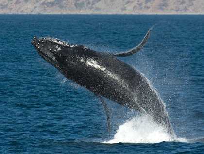 Our ship got underway at midnight from the festive port town of La Paz. As the sun rose, we were moving slowly along the spectacular mountains of the Baja Peninsula in an area known as Cabeza de Mechudo. Banded layers of volcanic ash caught the rosy light of the morning sun as we headed northward into a body of water known as San José Channel between Isla San José and the mainland of the Baja Peninsula. Our morning was spent cruising and searching for marine mammals. No sooner had we finished our breakfast than a humpback whale was sighted at the northern end of the channel. This was no ordinary whale, but rather, a spectacular acrobat that treated us to a thrilling show of aerial behavior, breaching fully out of the water time and again to our great delight.