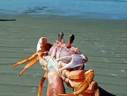 Pausing at the top of the highest dune, the sweeping vista encompasses 12 miles of undeveloped white beach bracketed by two mountainous reddish rock headlands. We were drawn irresistibly toward the ocean’s edge where many of us enjoyed a swim through the gentlest of the azure breakers. Thousands of large sand dollars have washed ashore here and the shells, bones and carapaces littering the area make for delightful beach explorations. A ghost crab experiencing a moment of inattention was temporarily caught by Justin, our Undersea Specialist. These arthropods burrow deep in the sand above the high tide line, delicately slurping detritus off grains of sand and balling up the ‘clean’ sand outside their holes. Ghost crabs can hold water in their gills and carapaces to support them in spending time out of the water feeding.
