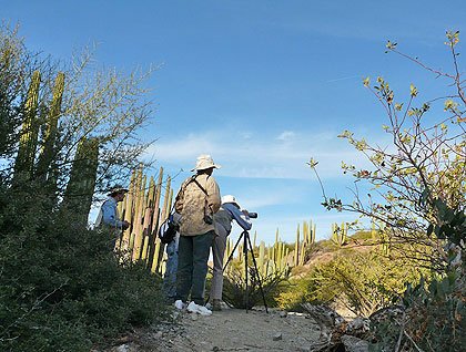 Hull Canal, the narrow mangrove-lined channel between Isla Magdalena and the peninsula provided excellent afternoon opportunities for watching shorebirds and scouting for gray whales. Just as the announcement was made for Colina Coyote, the high dune that marks the beginning of the nursery lagoon, the first California gray whale of the afternoon was sighted! Out on deck, everyone scouted intently and as we cruised northward, 11 whales were sighted, 7 singles and 4 mothers with calves. For thousands of years, these unusual baleen whales have made the incredible 11,000 mile annual migration to come to these calving lagoons and bear their young.