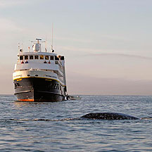 Our Zodiac tours left the fantail at 7:00am, with golden rays of light decorating the surface of the waters around each boat. Blows had been seen in all directions around the NG Sea Lion allowing for very short travel distances, followed by engines being taken out of gear, and we were once again in the company of grey whales and immersed, so to speak, in their world. Baby grey whales, approximately four weeks in age surfaced, took a breath, dove, and continued this process as mothers remained close by. The mothers took one breath to every three or four breaths of their babies. Several cow/calf pairs were practicing spy hops; the mother lifting her head out of the water to eye level then falling into the incoming tidal current. Then, the baby would lift its tiny head up out of the water and also fall into the tidal current or often over the body of its mother. There were several adult animals, also, working the tidal currents all getting in good practice for the northbound journey traveling against the prevailing coastal currents heading north toward their summer home in the Chukchi and Bering seas of northern Alaska.