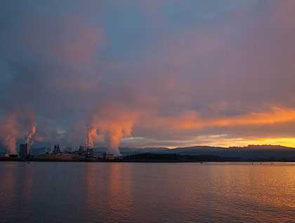The first rays of the sun greeted us this morning just offshore from Rainier, OR and Longview, WA. The Port of Longview was already bustling at this early hour. Logs were being loaded on ocean-going vessels, feathery plumes of steam were rising from the paper plant, and barges full of chips were in position for dumping. Within minutes Mother Nature splashed a brilliant pink swath of paint across the eastern sky.