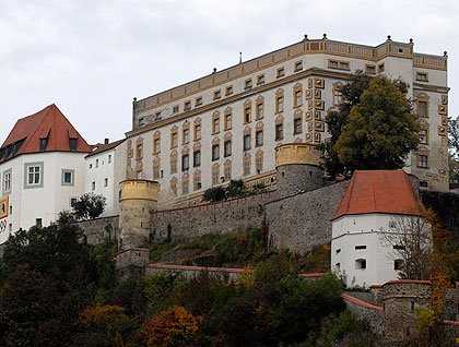 Early on Passau became a Free Imperial City and Bishopric, and at one time its diocese extended to Austria and Hungary. We paused in the Prince Bishop's residence to see the splendid Baroque edifice adorned with a spiraling Rococo staircase, frescos and ornamental stucco. It was curious to note that several entrance doors to the palace had no steps, as the Bishop was enabled to step in directly from his carriage!