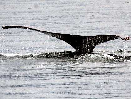 In the afternoon we cruised into Frederick Sound in search of marine wildlife. It was not long after lifting anchor that a cow and calf Humpback Whale were spotted near the shoreline. To our surprise and delight the young whale exhibited its exuberance for life by breaching entirely out of the water a number of times. Then late in the afternoon we watched a whale that we presumed was feeding at about a 200 foot depth, probably on zooplankton. We waited patiently for 6-7 minutes while the whale was down and then surface for air with a finale of a rise of the tail fluke. A few minutes after regaining our northward course there was another announcement to come to the bow.