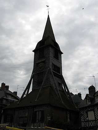 We entered the mouth of one of France’s most historic rivers, the Seine this morning and sailed past the great port of Le Havre on our port side. The Captain furled sails at 8:30AM. Even with a slight breeze we made 5 knots. Le Havre is France’s second most important port and Europe’s third busiest harbor. From Le Havre one can take ferries to a number of cities in England and Ireland. The picturesque town of Honfleur, population about 8 thousand, sits at the base of the hill of Côte de Grace which rises behind the town. Honfleur is justifiable famous for its beauty. Its colorful old center is nestled around the old harbor (Veux basin) and is a cornucopia of cafes, antique stores, bookshops and art galleries. The beauty of the city has long held an attraction for painters: the English watercolorist Bonington painted here, as did the French impressionist Eugène Boudin. One of the most interesting buildings is the mid-15th century Church of Saint Catherine and its entirely wooden bell tower both built by ship wrights and because built by peasants spared any damage in the French Revolution. We visited the Boudin Museum and saw a number of wonderful paintings completed in Honfleur, including some by Monet and Dufy. Honfleur’s fame is not limited to artists, however. Indeed its strategic location has made it a famous point of departure for some of the world’s great voyages of exploration. For example, Samuel de Champlain sailed from Honfleur on a number of occasions beginning in 1603 and on his 1608 voyage he founded the city of Quebec; LaSalle sailed from Honfleur in 1681 and was the first European to descend the length of the Mississippi River and he named the territory Louisiana after the great King Louis XIV. We toured the town and stopped in the wonderful old church of Saint Catherine, which was rebuilt in the 15th century after the end of the devastating Hundred Years War with England, which left both nations spent. The church has a fine wood interior and was largely built by the local shipwrights. A number of the old homes which survive feature this architectural style and make up a rather unique collection of old wooden homes. One of the curious features of the Church of Saint Catherine is its detached bell tower. Most French churches incorporate the bell tower into the continuous architectural fabric of the church making this feature at Honfleur a genuine architectural curiosity.