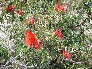 The rest of us boarded a bus that dropped us off in a desert area with a series of paths on it, to bird and plant watch. Many of the plants were new to us, having seen only a few desert plants before, on Isla Magdalena. Many of the plants were in bloom, such as the Adam Trees, hummingbird flowers, blue and yellow morning glories and San Diego daisies. A special treat was the fairy duster, seen here. Birds seen were hummingbirds, mockingbirds, turkey vultures and flycatchers.