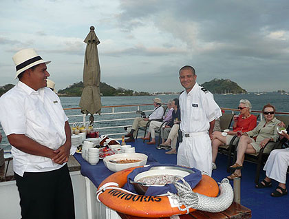 In the afternoon we had a different kind of experience, more related to our own history as human beings on this planet, and related to our capacity to design, to create, to transform, to build. We went through the first sets of locks of the Panama Canal. Everybody cheered up when the Panamanian pilot boarded the Sea Voyager to lead us through this feature that has changed the world. A passage in between two oceans, not to divide, but to connect. And to celebrate, Marco, our Hotel manager, prepared a feast of Ceviche and cocktails on the sky deck. Several birds flew along, and again, it was natural history in the hand of human history; hard to separate, and what for? This trip is to enjoy and taste it all!