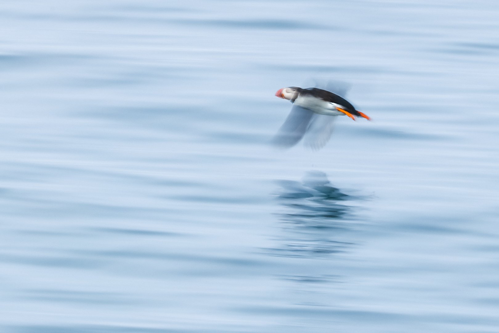 In tranquil mist-muffled seas we had crossed overnight from Bear Island towards mainland Norway, and we awoke to find ourselves approaching the small island of Fugløya (Bird Island). Immediately, the rise in temperature was palpable. The mist still clung to the island, however, tantalisingly revealing only a few feet of the lowest cliffs, everything else obscured from view, as we slowly cruised its eastern shore, hugging it close. This island is an important breeding site for Atlantic puffins, and the waters around our bow teamed with them. We watched with delight as the puffins paddled back and forth on the lazy surface, or dived beneath, using their wings to swim underwater with speed and great agility. The sharp-eyed also spotted razorbills amongst the throng, and even a White-tailed eagle sitting on a ledge watching the scene. Later in the morning Ralph Lee Hopkins continued our photographic education with a motivating talk on Creative Travel Photography, explaining at last what all those buttons and dials are meant for.