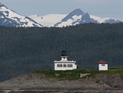 Soon it’s lunch time, and the start of an afternoon of cruising to look for wildlife. We continue our northerly route along Admiralty toward Point Retreat, and a wonderful view of the historic lighthouse that is also incredibly photogenic, with snow-capped mountains as a back-drop. Along the way, Sea Lion encounters a single humpback whale, but it seems to be just cruising to a destination that it alone knows. So we eventually make an about-face, and motor across to the western shore of Lynn Canal to look again for wildlife, this time along the mainland coast. We head back south toward Icy Strait, and a path that will take us to the area for our operations the next morning.
