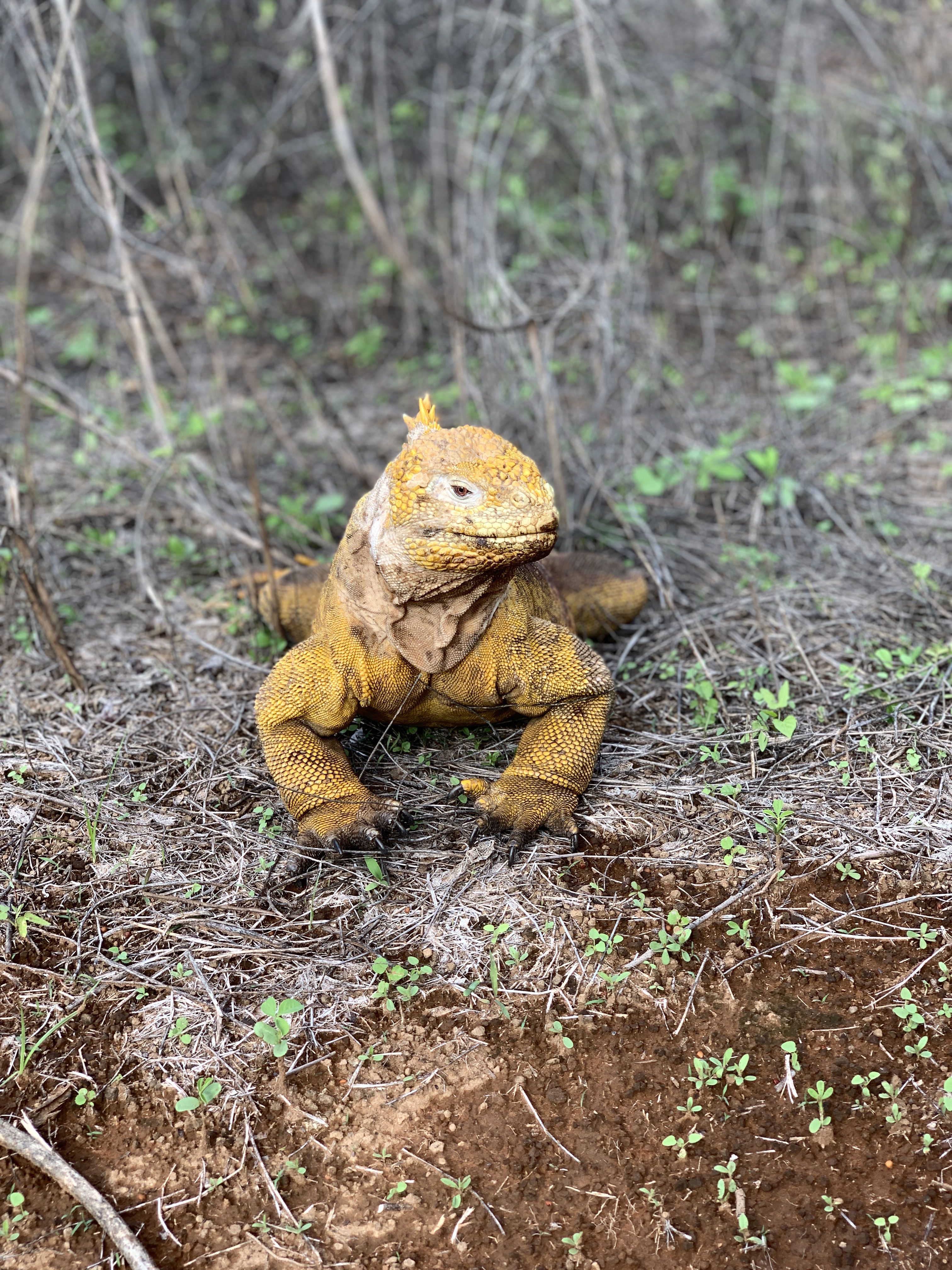 Photo caption and credit: A colorful Galapagos marine iguana warms up under the sun with a sea lion in the background. Photo by Gilda Gonzalez