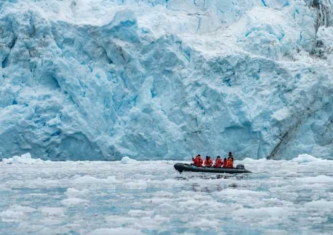Today was a truly fantastic day for our expedition. After arriving in the morning to the Garibaldi Glacier we left National Geographic Orion to explore the ice face and the fjord in the Zodiacs. It did not take us long to realize that this is a remarkable place not only due to the advancing glacier that calves into the fjord, but also to the surrounding forest of nothofagus or southern beech trees that grow all the way to the edge of the ice and snow. Along the steep walls of the fjord, a large number of waterfalls cascade into the water, contributing to the presence of glacial flour or finely ground stone that gives the water almost a milky appearance. We were not only taken aback by the imposing glacier wall and its stunning blue colour, but driving through the brash ice of the fjord allowed us to experience this place with all our senses: the sound of the ice being pushed by the Zodiacs, the water falling from the heights of the stone walls into the fjord, and the thundery sound of the calving glacier really added a new dimension to the whole experience.