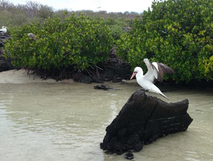 Today we arrived at the caldera of Genovesa Island. A light rain greeted us as we arrived at this extinct volcano. We got ashore and had an outstanding time observing lots of birds flying around us, as well as Galapagos sea lions and the smallest Galapagos marine iguanas on the archipelago.