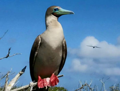 Today we were welcomed by a clear sky, as we started our day on Darwin Bay beach. Our hike today took us on a loop with many excellent opportunities for bird watching. Swallowed-tail gulls were nesting around on the sandy terrain, while red-footed boobies were building their nests up in the branches of the mangrove trees. Nazca boobies were seen preening themselves on the rocky cliffs, and frigatebirds flew overhead, chasing other birds in order to steal their fish.