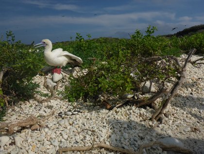 Today we arrived at the last island of our expedition: Genovesa. This lonely rock is populated by more than a million nesting birds, and is known as “Bird’s Island” for this reason. Birds here don’t fear humans and therefore most of the time unphased by our presence. Early in the morning on this warm day, our first activity was kayaking. After breakfast we landed on Darwin’s Bay, where there is a beach made of broken pieces of white coral and where our trail was located. We did not have to search too far before finding birds, especially the highlight of today’s visit: the red-footed boobies. We also found frigate birds who were feeding their babies as they returned from stealing fish from other birds! After a hot morning, some of us needed to refresh and so we went snorkeling in these waters which were full of big animals like rays and turtles. We even had the chance to see some playful sea lions.