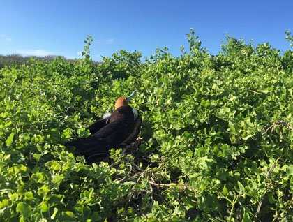 The other groups hiked along a small coralline sand beach, where a slightly different array of wildlife can be seen.  Red-footed boobies nesting in mangroves along the coast line, others on low bushes, frigatebirds in their breeding season, inflating their huge red pouches to attract the females that fly around in search of potential mates. Sea gulls were everywhere—this variety is so beautiful, and they differ from others in that they hunt at night, preying mostly on squid and flying fish.
